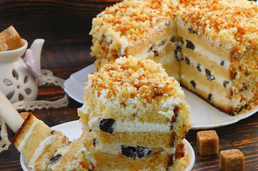 Торт “Дорогому гостю” готовий. Залишилося прикрасити. Найпростіший варіант – подрібнити залишки коржу, обсипати з усіх боків і можна подавати до столу.