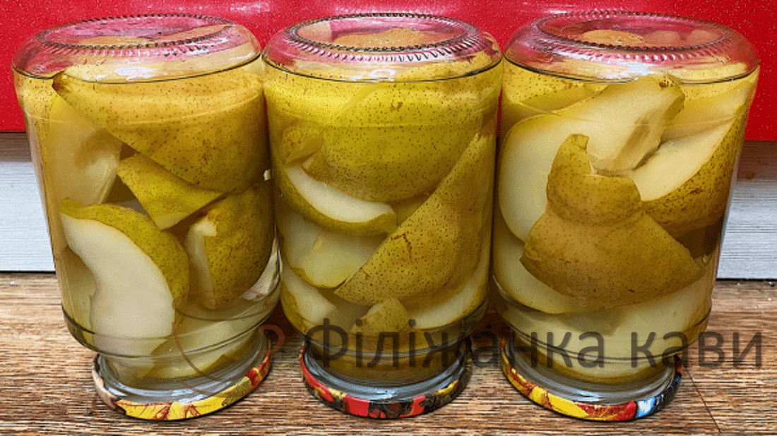 У мене вийшло 3 банки об’ємом 900 мл. І помістилося в них 7-8 великих груш.
